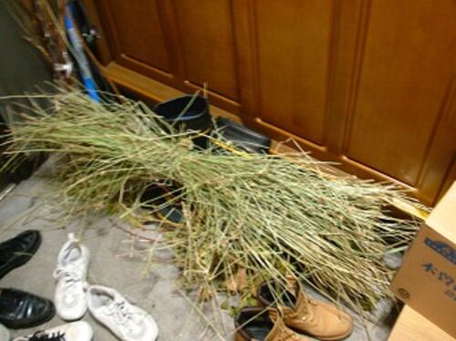 橋のところの土手に生えていた木が刈られて、斜面の上の方にあったので 斜面にのぼって1本もらった。 刈られてから時間が経っているようで葉は腐りかけていたので 散らかさないようにして置いてきた。 次の日に行ったら、歩道の方にあげてあったので 歩道か…